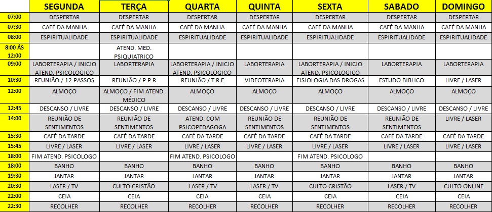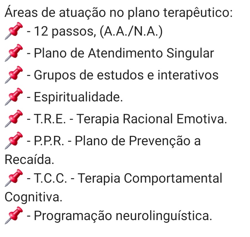 Tratamento baseado em 12 Passos de A.A. (Alcoólicos Anônimos) e N.A. (Narcóticos Anônimos) bem como Terapia Cognitiva Comportamental (TCC).